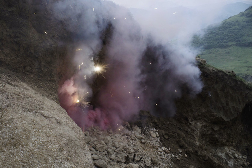 A camera navigates through what the artists have called a performance: bespoke fireworks were set off in an open-air coltan mine near Numbi in the Democratic Republic of Congo. The fireworks had been imported from Liuyang, the epicentre of China’s fireworks industry, and set off remotely over an unstable connection.