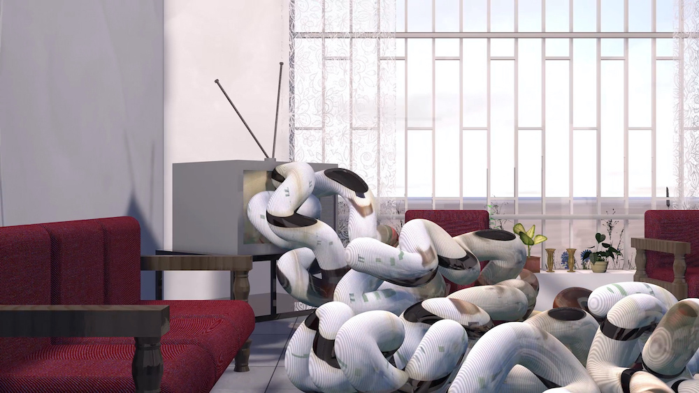 The CGI film features a recreation of Al-Sabah’s former home in Iraq, which his family cannot return. As the film moves through the house, digital images begin to escape from the forgotten TV and computer screens and materialise into living forms. These forces surge out in utter destruction, invading the domestic realm without restraint. We then hear a narration in Arabic from his grandmother where she describes the burning of sentimental objects in the home before fleeing, and digital fabrications of these objects appear before disintegrating.