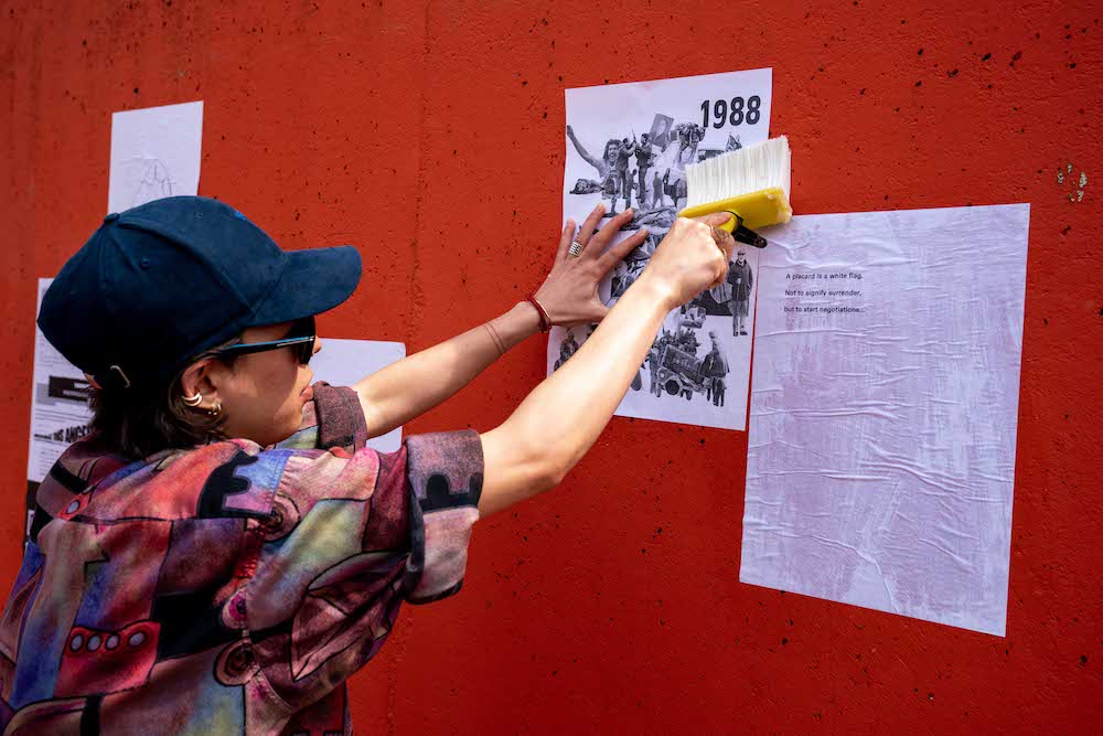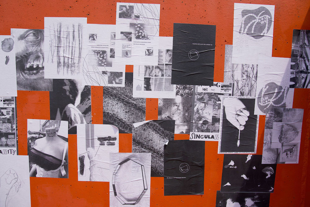 STRIKE launched at Presse Books Fair on Saturday 17th June 2023 at FormaHQ. In a performative happening, STRIKE’s pages were ‘assembled’ live and pasted onto the brutalist orange concrete walls of Peveril Gardens, which sits atop Forma’s building.